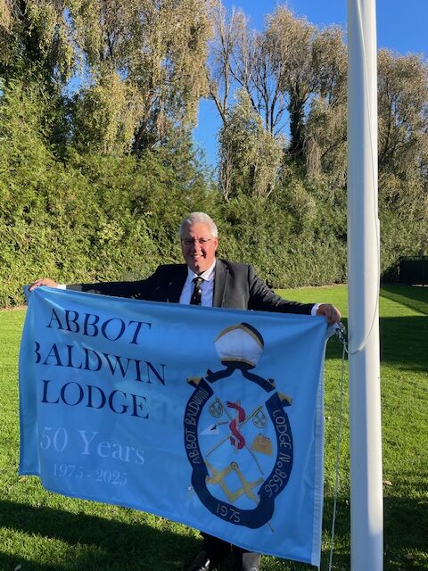 Abbot Baldwin Lodge No.8656 celebrated its 50th Installation meeting on Monday 6th October 2025 at Ashlar House in Bury St.Edmunds. In the build up to this important day in our history; a bespoke commemorative flag was commissioned which will be flown at Ashlar House at each of our regular meetings. The outgoing WM, W.Bro Jonathan Cobbold, was the first member to have the privilege of raising it in the presence of members; guests and particularly V.W.Bro Roger Nash, Deputy Provincial Grand Master, before the Installation Ceremony commenced.