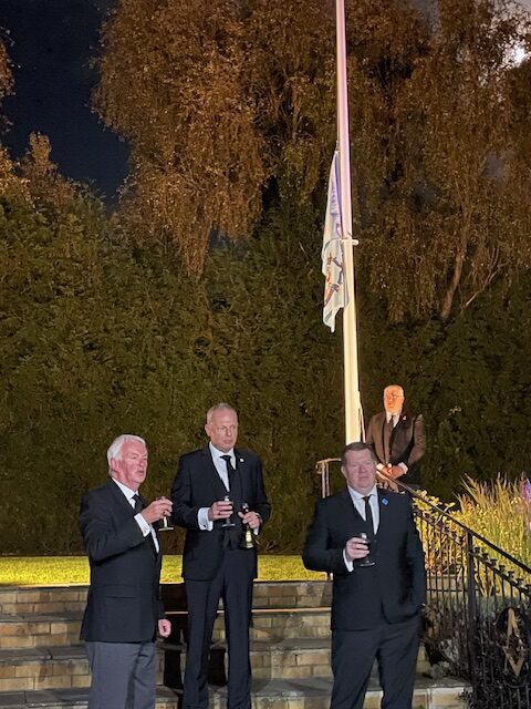 In the minutes leading to 9pm, all those present, gathered in sight of the flag which was lowered to half mast with due solemnity at the appropriate minute and to the sound of the unique ‘Bellamy Bell’ to remember Absent Brethren under the leadership of the newly Installed WM, W.Bro Richard Day.